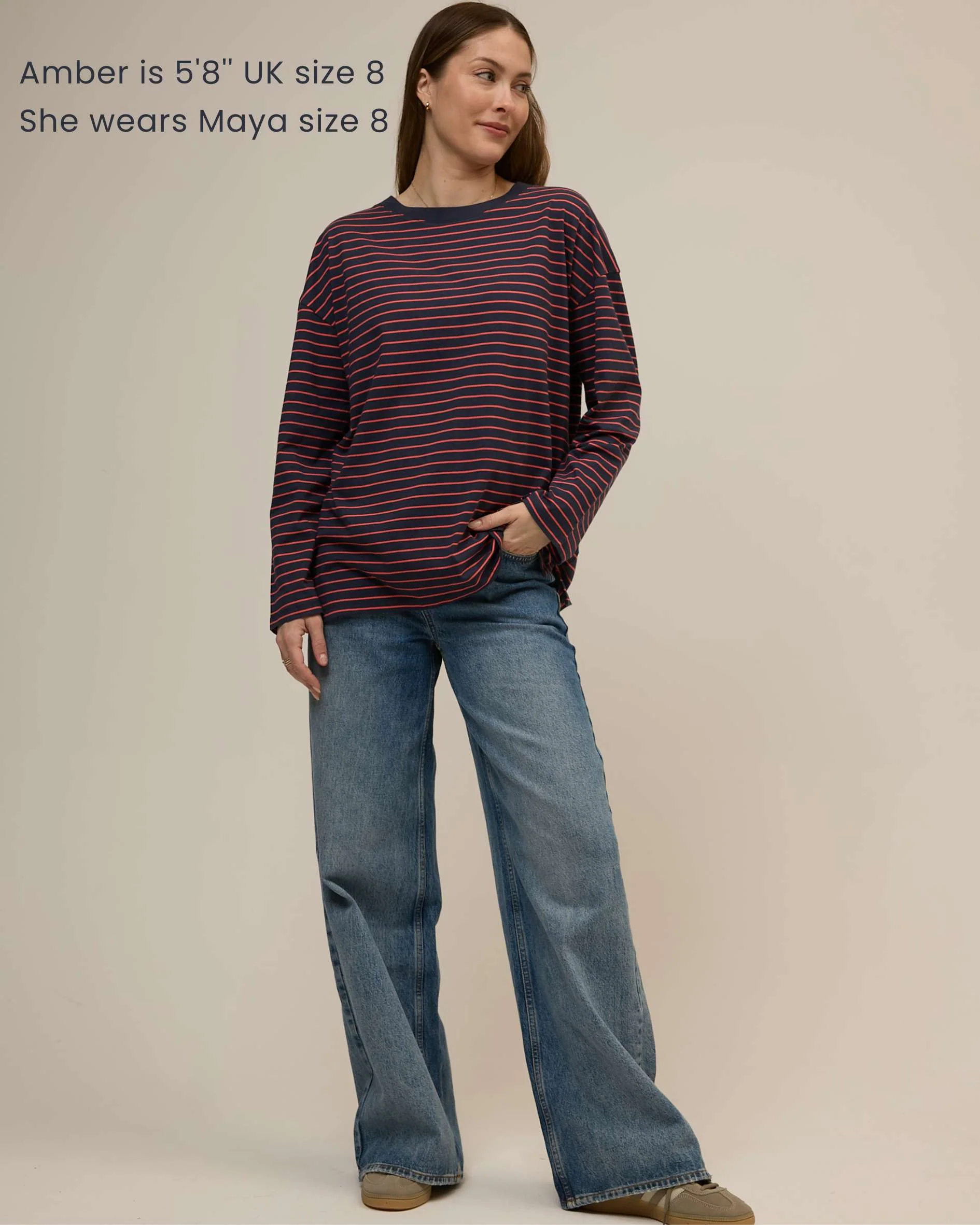 The relaxed cut tee you'll rely on for years and years. Maya is our casual, boxy long sleeve tee with a dropped shoulder, now in a vintage navy and watermelon fine stripe. In our premium quality organic cotton that we're known and loved for, you'll love Maya's incredible washability - making this a staple top you'll feel great about wearing.