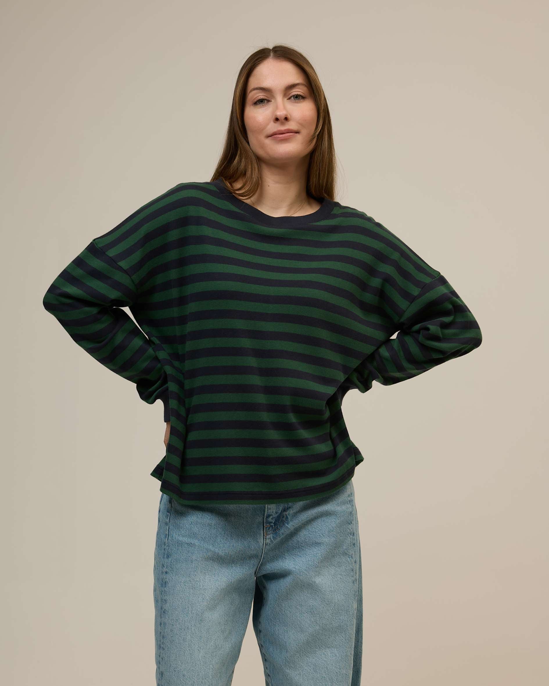 The perfect balance between a classic tee and cosy sweatshirt in the softest organic cotton. Sally in our navy and green stripe is crafted from the absolute softest, organic cotton interlock jersey. Sally's your go-to, lightweight sweatshirt you can wear solo or layer effortlessly.